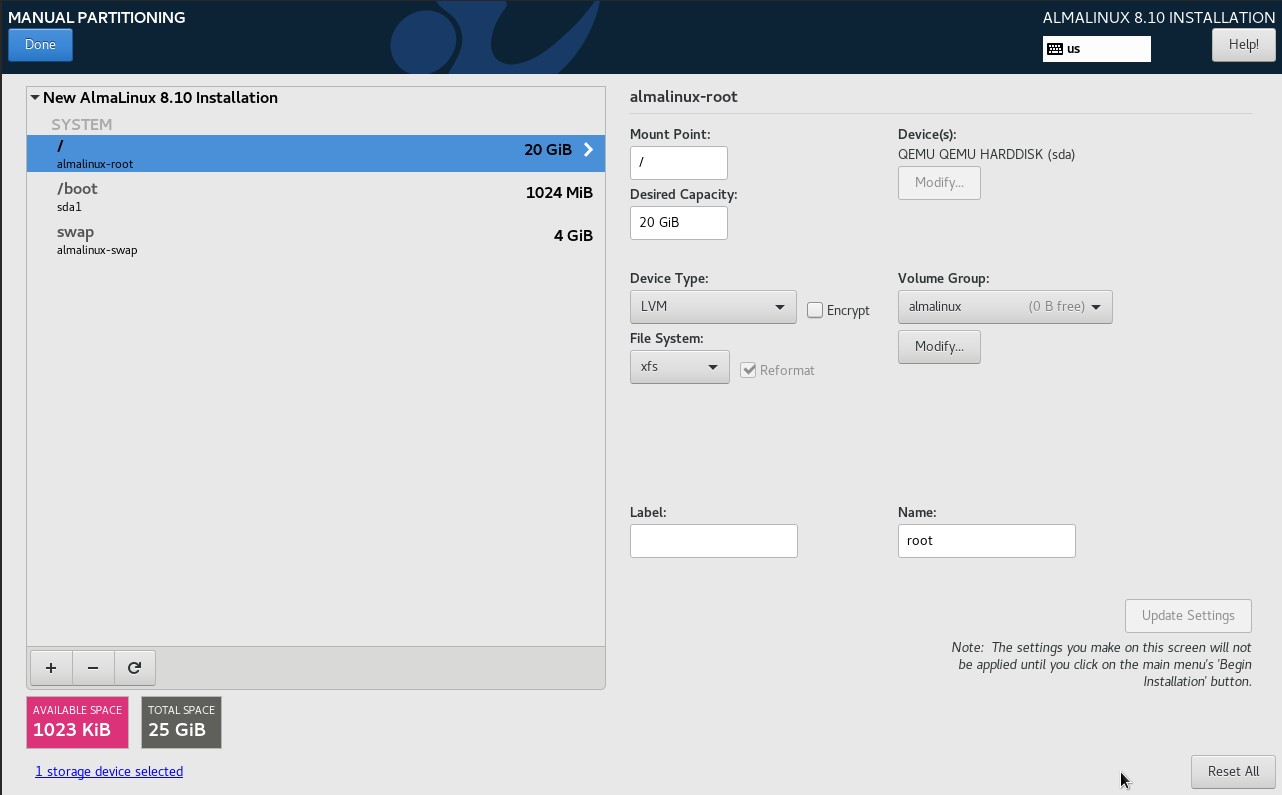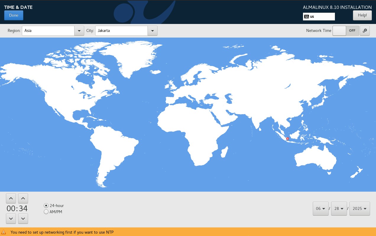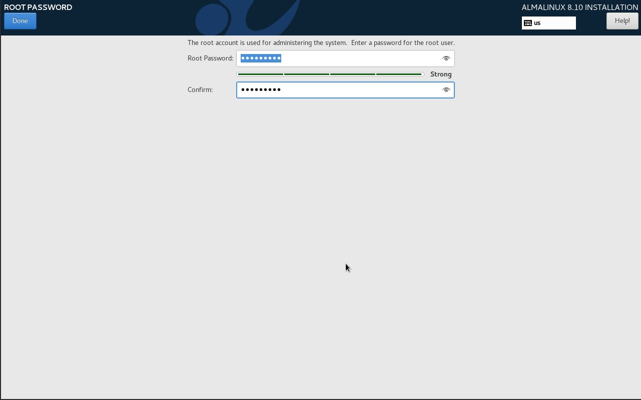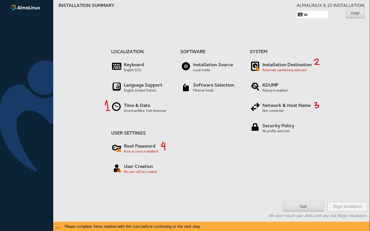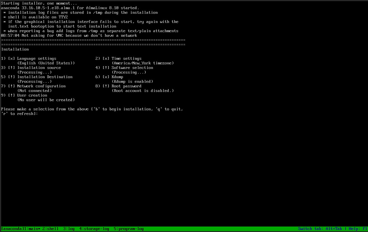 mode as it does not require a graphical GUI view for the server. When installing AlmaLinux the first thing I did was set the Timezone, Installation Destination, Network, and Root Password.