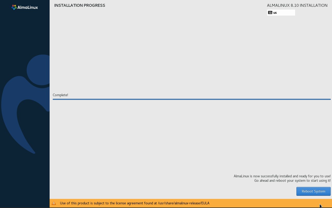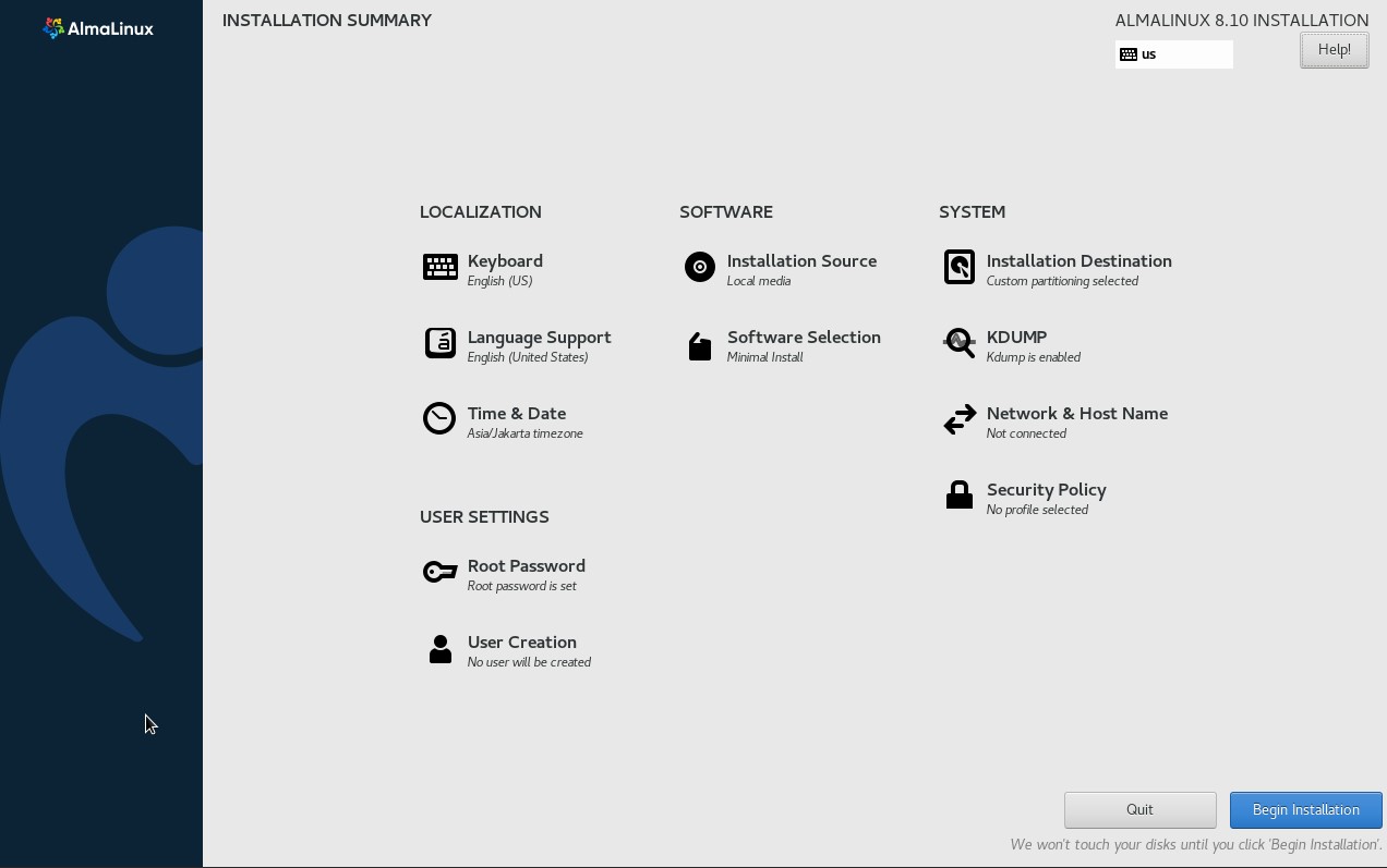 Here is the GUI mode installation view on AlmaLinux. Despite the GUI view, I will use the Minimal Install