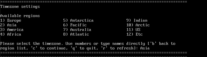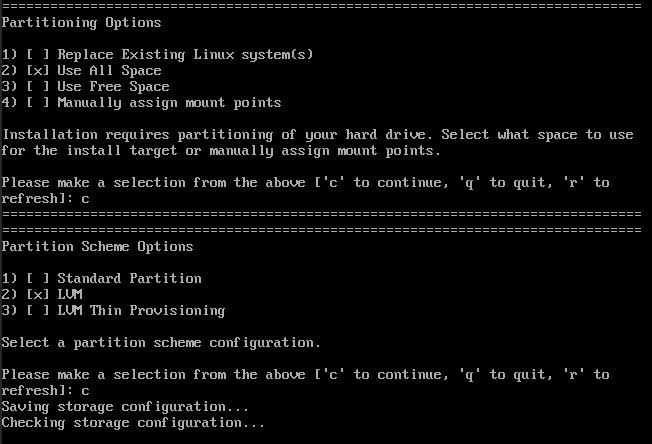 The next step is the partition setup, because the CLI is quite limited at this time we will directly partition the LVM mode. Please press the number 5