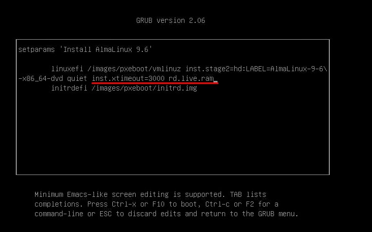 linuxefi ... quiet ... ins.xtimeout=3000 rd.live.ram