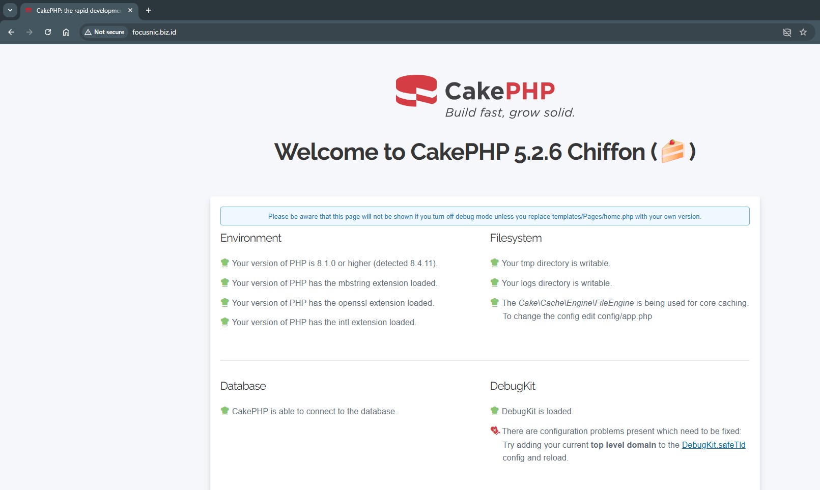 Access the CakePHP installation through a browser, for example: http://focusnic.biz.id