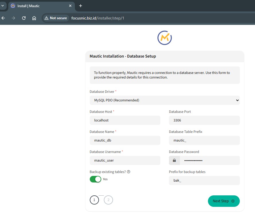 Set up the Mautic database, making sure to use the database, user, and password you created earlier. Continue until the database table creation process is successful.