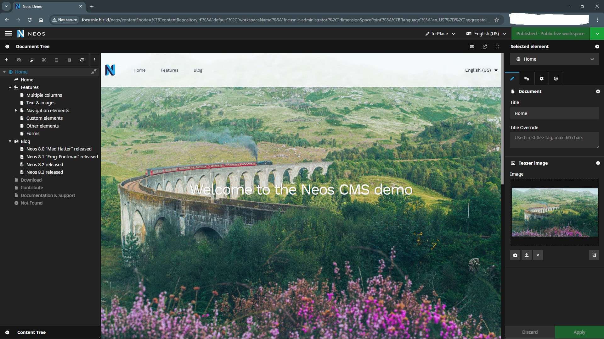Access the Neos installation via a browser, for example: http://focusnic.biz.id'. This is the default view of the Neos CMS. <br/> The Neos admin dashboard is displayed, accessible via