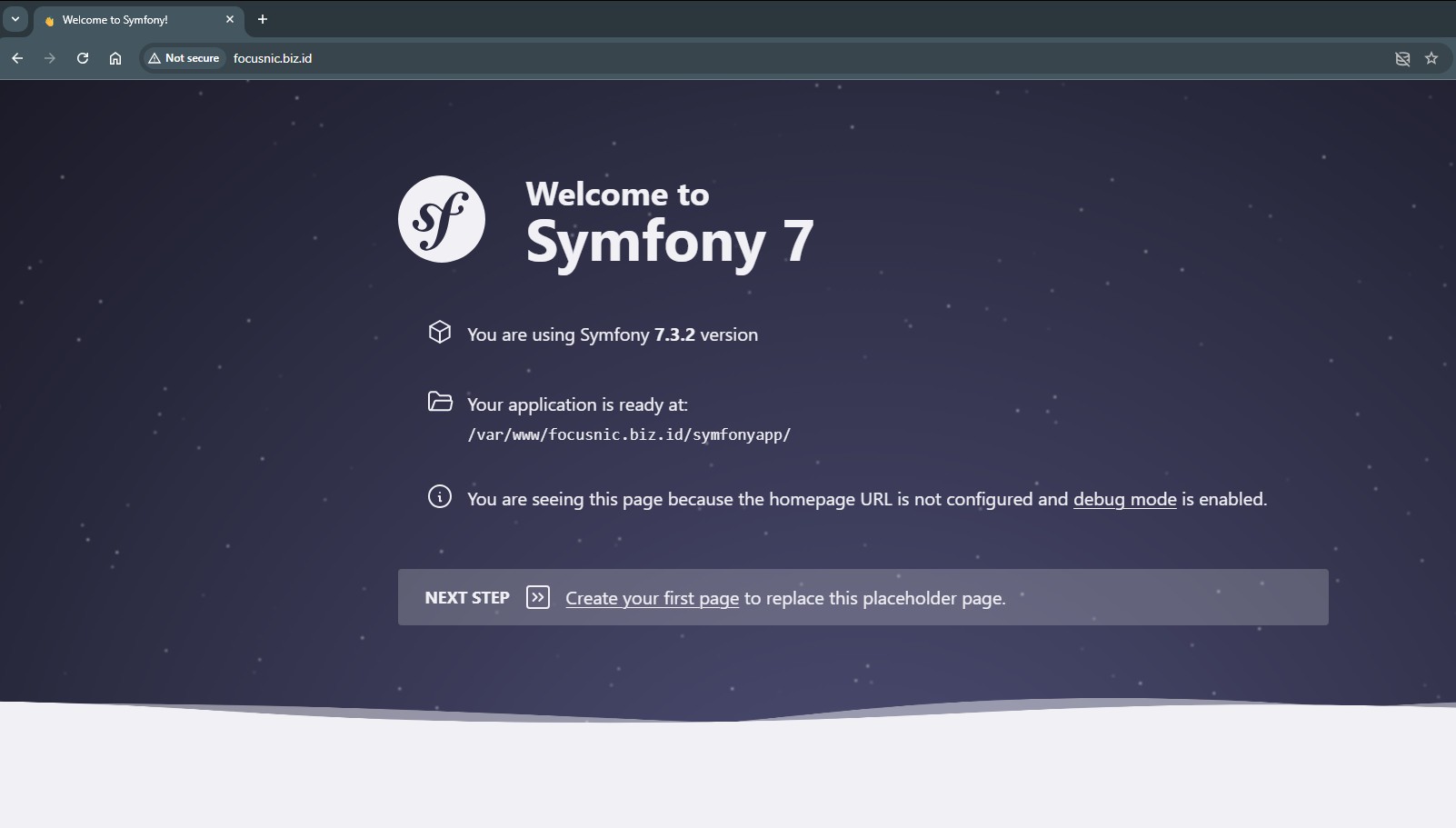 Access the Symfony installation through a browser, for example: http://focusnic.biz.id