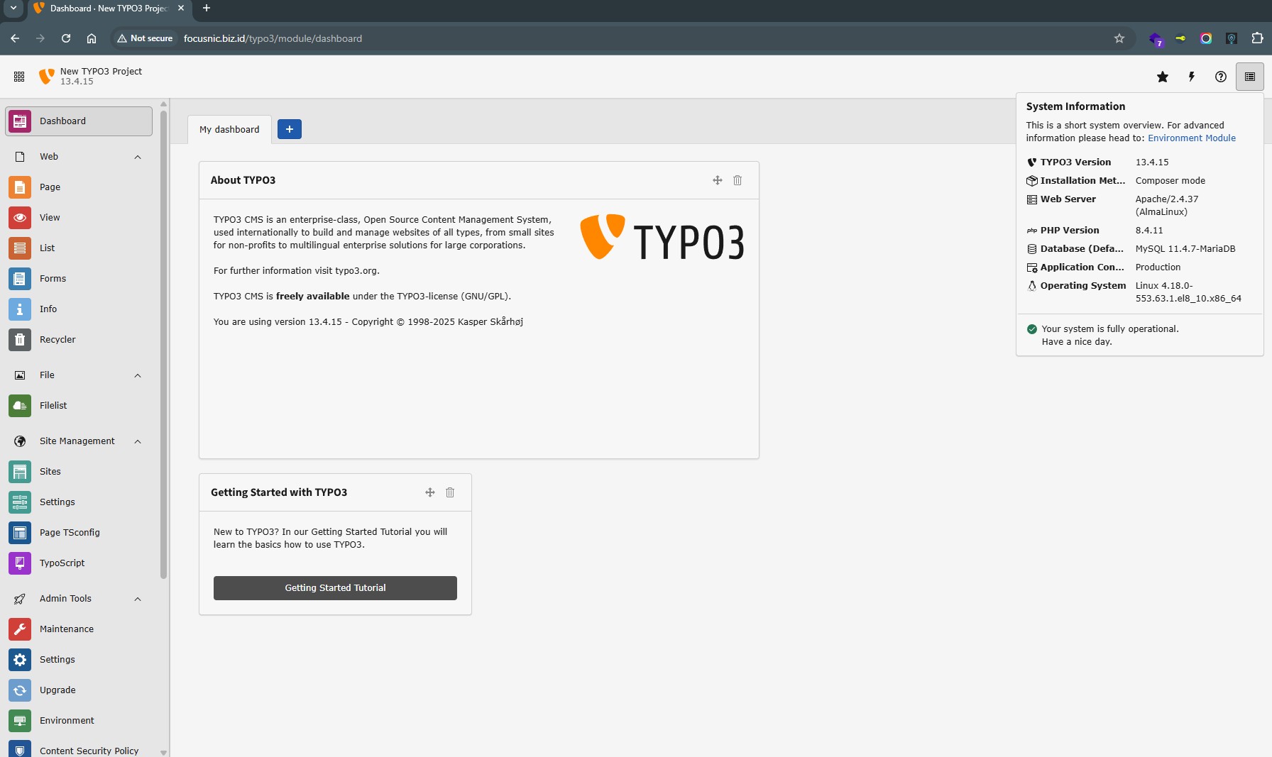 The following is a screenshot of the TYPO3 admin dashboard, accessible via http://$DOMAIN/typo3