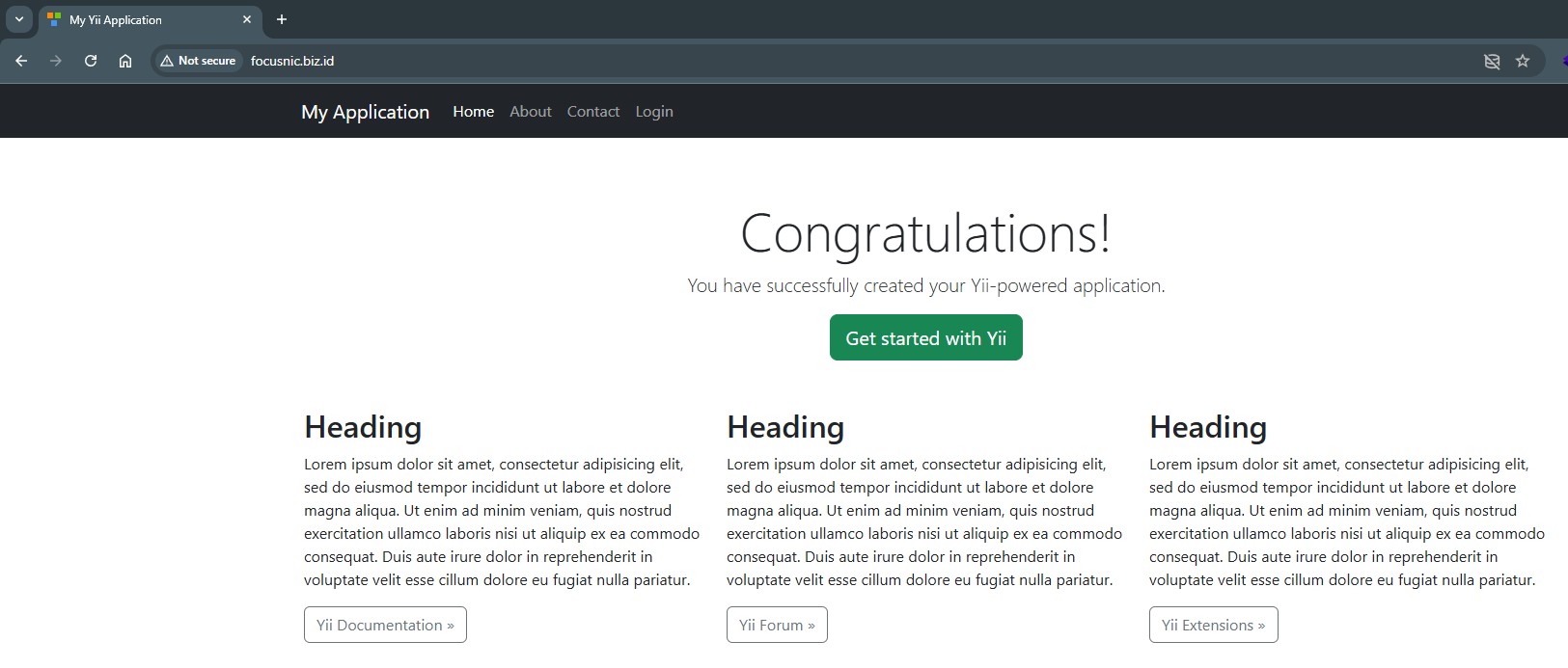 Access the Yii installation through a browser, for example: http://focusnic.biz.id